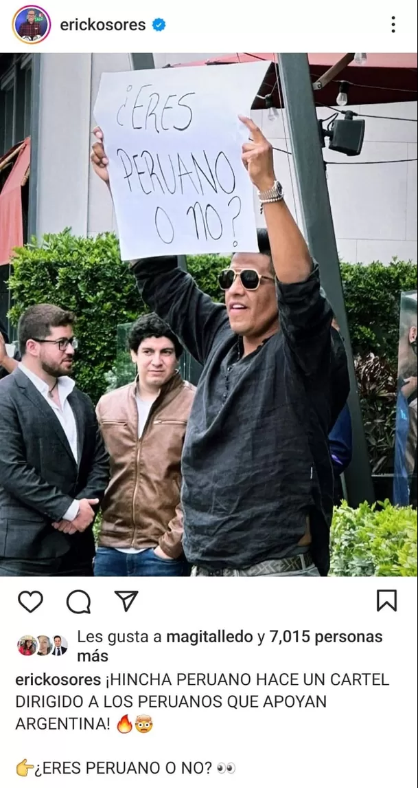 Erick Osores, publicó una imagen tomada por la periodista Darinka Zumaeta, en la cual muestra a un hincha peruano sosteniendo un cartel con la frase: “Eres peruano o no?”, el cual iba dirigido a los miles de peruanos que están apoyando a Argentina desde el hotel de concentración de los futbolistas albicelestes.