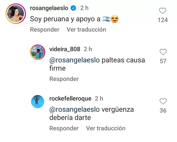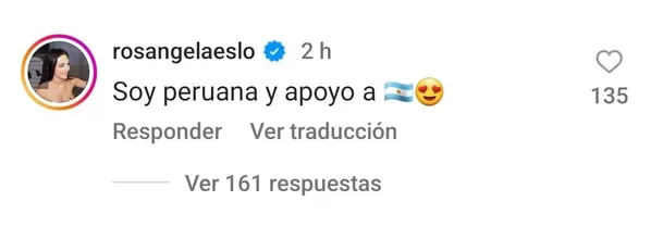 Dentro de los comentarios de este posteó, sorprendió ver el de Rosángela Espinoza, quien no dudó en responder a esta fotografía con una polémica postura, que le ha generado cientos de críticas por parte de hinchas peruanos tras escribir: “Soy peruana y apoyo a Argentina”.