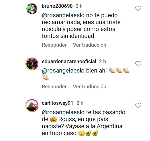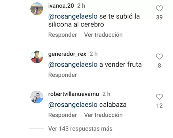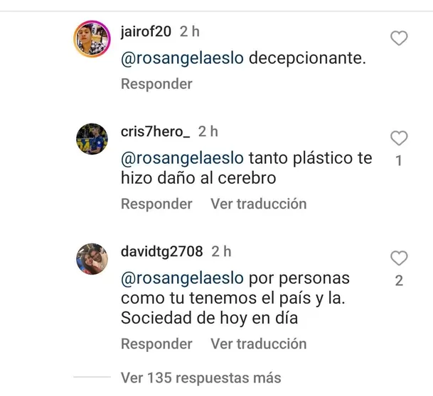 Los usuarios no escondieron su malestar ante esta afirmación de Rosángela, a quien señalaron como "antipatriota", "sin identidad", "posera", y demás calificativos, que iban acompañados hasta de insultos hacia la guerrera, a quien se le ha visto en algunos ocasiones presente en el Estadio Nacional apoyando a la selección peruana con la camiseta blanquirroja.