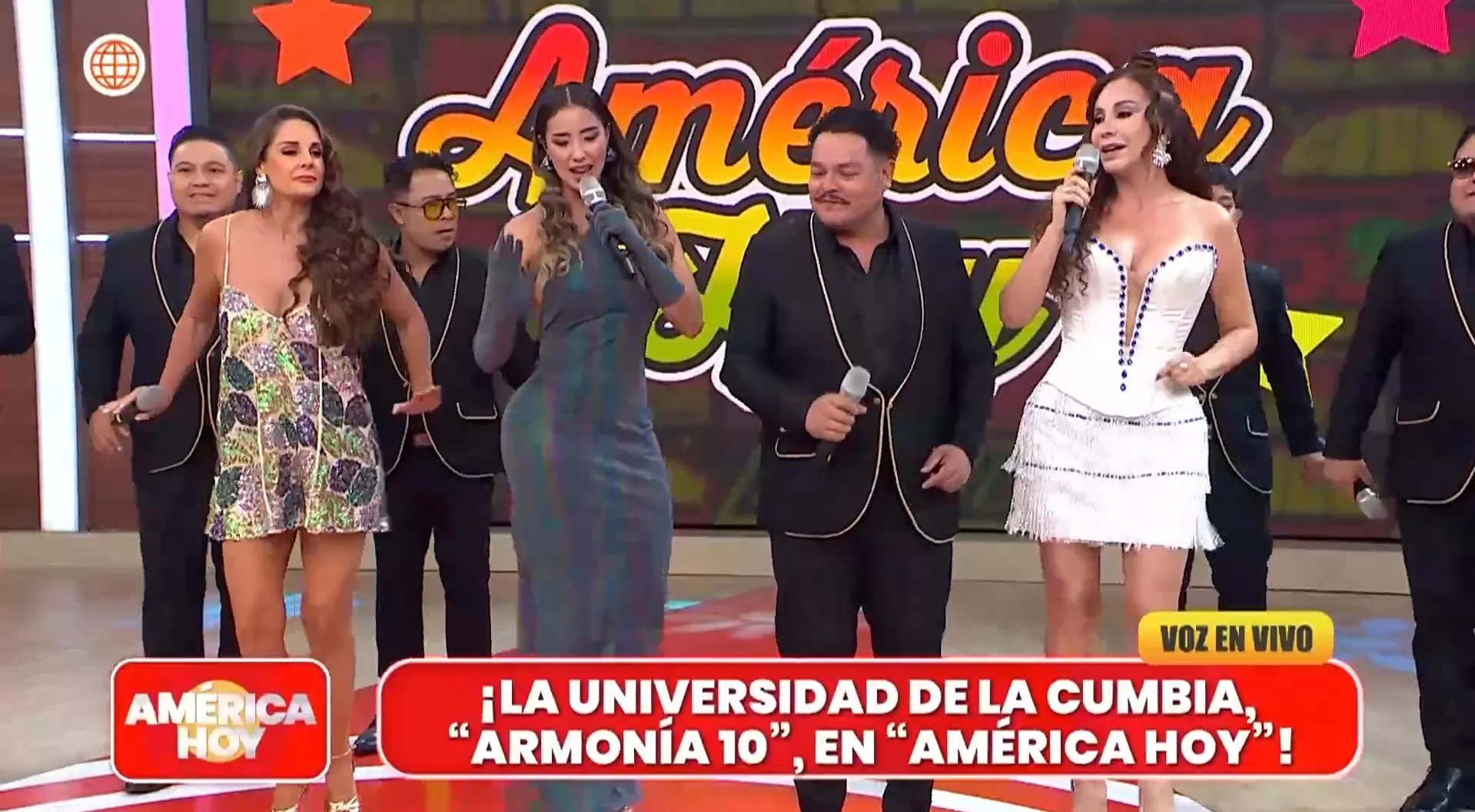 La agrupación Armonía 10 visitó el set de América Hoy para poner a bailar a todos los conductores del magazine y cuando Xiomy Kanashiro se animó a bailar el tema "El Cervecero", la colaboradora no dudó en imitar a Christian Cueva, quien popularizó una frase durante una de sus presentaciones de cumbia que tenía con Pamela Franco.