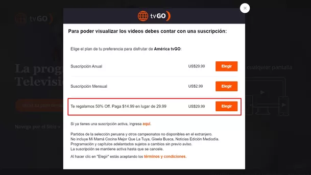 Paso 1: Ingresa a América tvGO, haz clic en "Inicia tu plan desde $2.99" o en "Suscríbete".