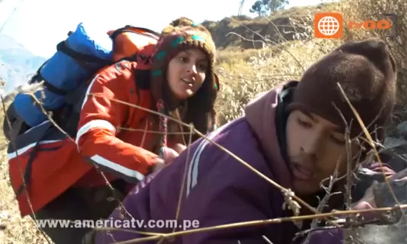 Luego de conversar con unos pobladores y preguntarles sobre la ruta, el joven sufre un resbalón que asusta mucho a su enamorada.