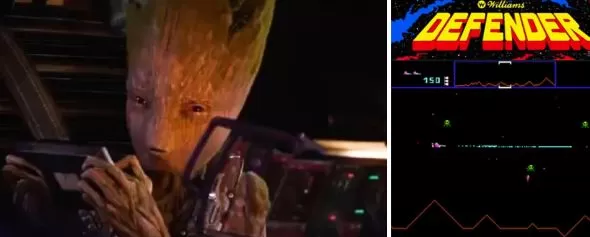 El juego portátil que Groot está jugando se llama Defender, un juego de arcade de los años 80 en el que el jugador debe vencer a los alienígenas invasores. ¡Y Peter probablemente se lo dio!