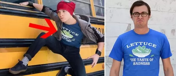 La camiseta que Peter Parker lleva puesta cuando sale del autobús escolar dice "Lechuga, el sabor de la tristeza". Puedes comprarla a 20 dólares.