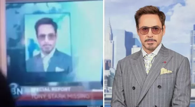 Esta imagen de Tony Stark en las noticias es en realidad una foto de Robert Downey Jr. en el estreno de la alfombra roja de ‘Spider-Man: De Regreso a Casa’.
