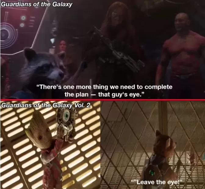Rocket también tiene algo con los ojos. Menciona tener ojos en las dos películas de Guardianes de la Galaxia, y le da un ojo a Thor en Avengers: Infinity War.