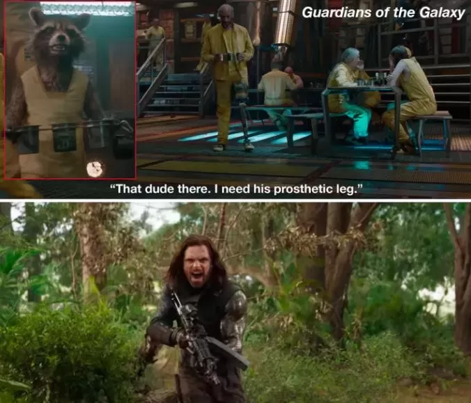 Rocket parece tener algo con las extremidades. En Guardianes de la Galaxia bromea que necesita la prótesis de un tipo y en Avengers: Infinity War le pregunta a Bucky: "¿Cuánto?" por su nuevo brazo que Shuri construyó.