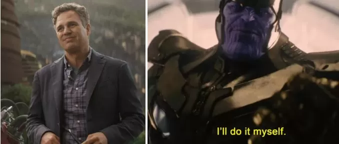 Y cuando Bruce Banner no puede dejar salir a Hulk, dice: "Lo haré yo mismo", como dijo Thanos en la escena de post-crédito de Avengers: Era de Ultron.