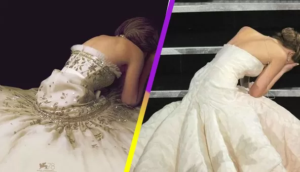Resulta que si bien el arte nos adelantaba que se venía un proyecto bastante dramático pues teníamos a Diana en un vaporoso vestido, caída y llorando, las comparaciones con otra imagen no se hicieron esperar. Resulta que los cibernautas notaron que el afiche de 'Spencer' era muy similar a la instantánea más viral de los Premios Oscar 2013, cuando Jennifer Lawrence, vestida de Dior, cayó mientras subía a recoger su Oscar por 'Silver Linings Playbook'.