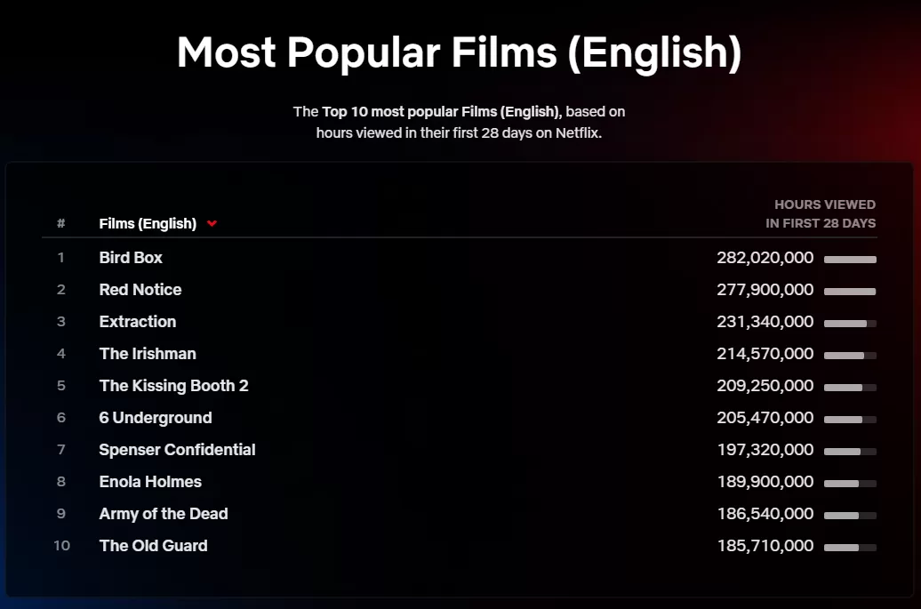 Así, el puesto número uno que pertenecía a 'Misión de Rescate' de Chris Hemsworth pasó a segunda posición con sus 231 millones de minutos reproducidos, cediéndole la primera posición a 'Birdbox: A Ciegas' de Sandra Bullock con 281 millones de minutos reproducidos.