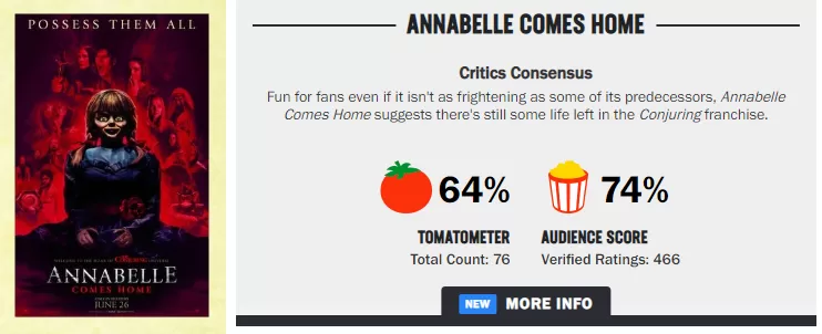 En cuanto a la franquicia general, El Conjuro sigue siendo el rey, ya que el trabajo del director James Wan cuenta con un 85% de aprobación. En la parte inferior está La Monja, estrenada el año pasado que obtuvo una calificación bastante baja del 26%.