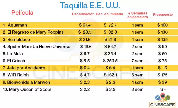 Resulta que Aquaman no solo es el Rey de Atlantis sino también el Rey de la cartelera norteamericana. Este fin de semana fue el esperado debut de Jason Momoa en la aventura en solitario de su personaje dentro del UEDC y vaya que se notó fue el gran favorito de los cinemeros.