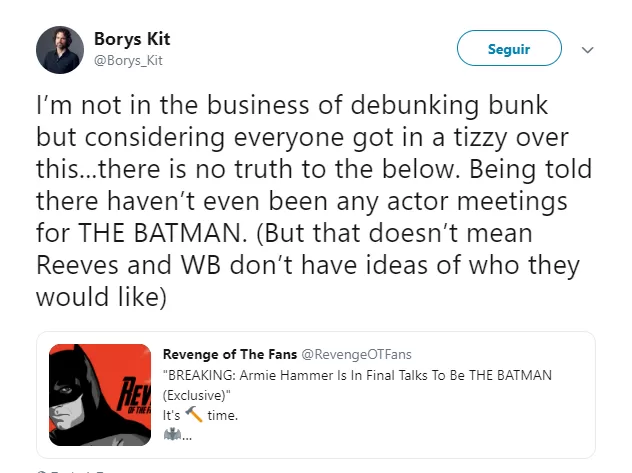 Para complementarlo, Borys Kit de The Hollywood Reporter confirmó que la información no es verdadera y que de hecho sabe que no se han realizado reuniones con ningún actor para el papel.
