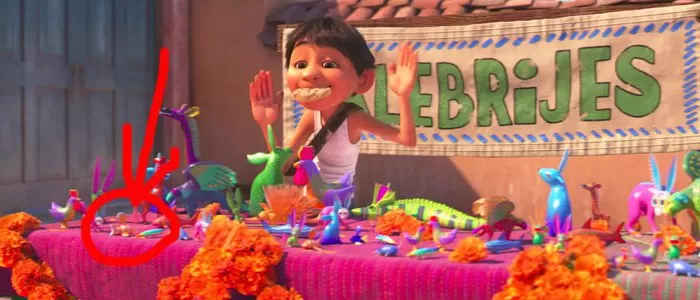 Asimismo, mientras Miguel camina por Santa Cecilia, entre los alebrijes a la venta en la Feria del pueblo, podemos ver a un pececito que se nos hace familiar. Nemo de nuevo.