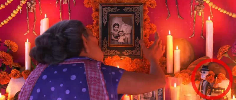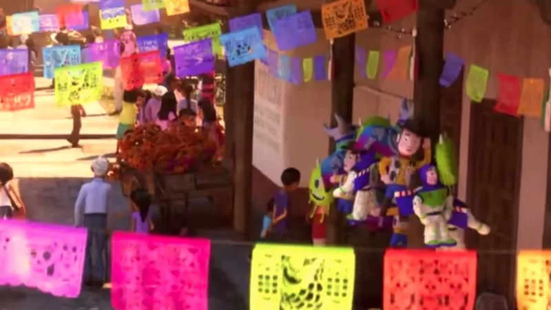 Mientras recorremos las calles del puebito de Santa Cecilia, en una toma abierta se pueden observar algunas piñatas. Entre los personajes claramente podemos distinguir a Buzz Lightyear y Woody de Toy Story, así como a Mike Wasowski (y Sully) de Monsters Inc.
