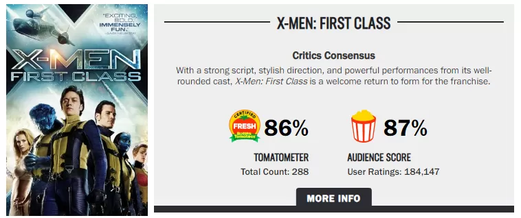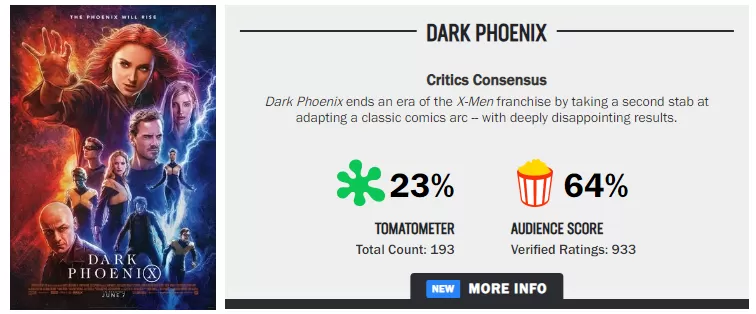 Como puedes ver, X-Men: Dark Phoenix se ubica, en gustos de los cinemeros, ligeramente por debajo de X-Men: Apocalipsis, si bien el puntaje promedio puede ser inferior.