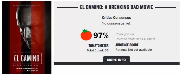 El Camino ha debutado con un 97% a partir de 32 reseñas y los críticos resaltan que es sumamente entretenida y una buena conclusión a la historia de Jesse Pinkman. Además, dicen por ahí que Aaron Paul se luce en su actuación.