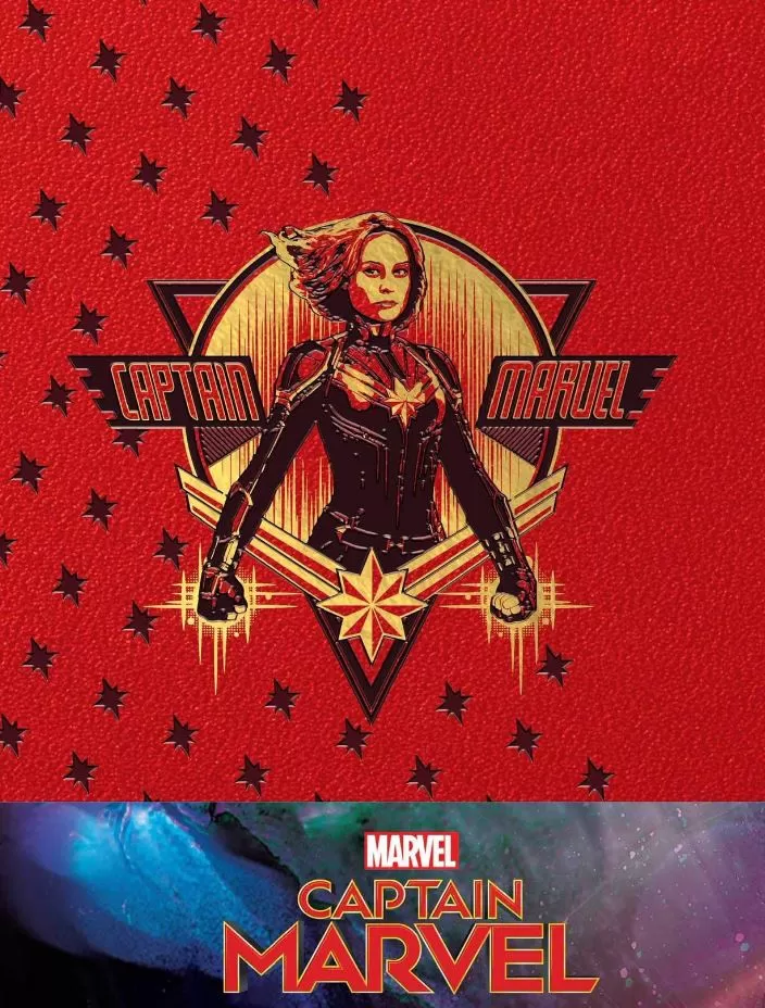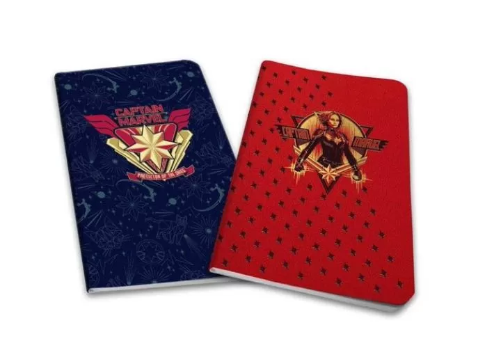 Disney ha lanzado nuevos diseños oficiales que son parte del merchandising oficial de la película que muestra al personaje principal, protagonizado por Brie Larson. Podemos ver cuadernos con un estilo añejo y clásico como en los cómics, el logotipo y una frase que dice “protectora de los cielos”.