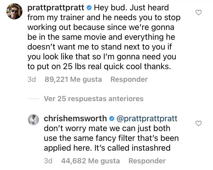 Los comentarios son lo mejor, pues sabemos que en esta entrega, además de Christian Bale, Natalie Portman y Tessa Thompson también formará parte Chris Pratt como Peter Quill/Star Lord. El actor ha hecho un comentario en la fotografía que se llevó muchísimos likes y donde pone en evidencia que ante el físico de Hemsworth, él también tendrá que entrenar duro si no quiere verse opacado: