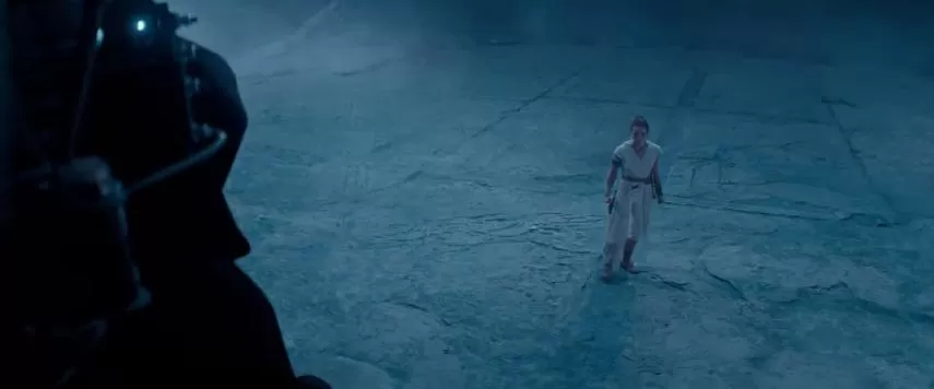 Más adelante, se ve ligeramente que Palpatine tendrá forma física, pues lo que se deja ver es su túnica de espaldas en una especie de trono. La reacción de Rey es la de "haber visto un fantasma".