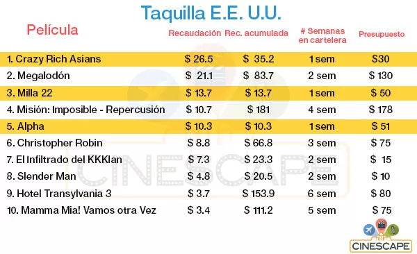 Este fin de semana llegó a las salas norteamericanas Locamente Millonarios (Crazy Rich Asians) y desplazó del primer lugar a la taquillera Megalodón. Esta cinta de bajo perfil y de un presupuesto modesto (tomando en cuenta los abultados costos de megaproducciones hollywoodenses) logró recaudar $26.5 millones y con ello lograr el primer lugar de la taquilla y deja a Megalodón en el segundo lugar con $21.5 millones.