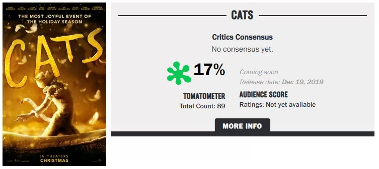 "Cats - la película basada en el famoso musical que se estrenó esta semana - ha sido lo peor que le ha pasado a los gatos desde los perros" - escribió el crítico de cine Edward Douglas en la revista Comic Beat.