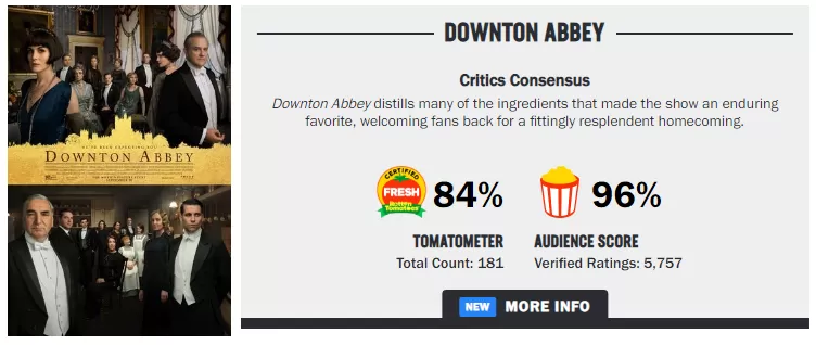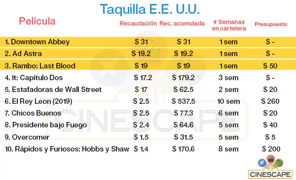 La película basada en la exitosa serie británica Downton Abbey ha logrado conquistar a los cinemeros norteamericanos y suma un total de $31 millones aunque en su taquilla mundial ya ha logrado recaudar $61 millones (de los cuales $7 provienen únicamente del Reino Unido). La excelente noticia es que tanto críticos como audiencia han logrado disfrutar de la película e incluso es el segundo grupo el que mejor la califica en Rotten Tomatoes. En el portal CinemaScore obtiene una calificación de A.