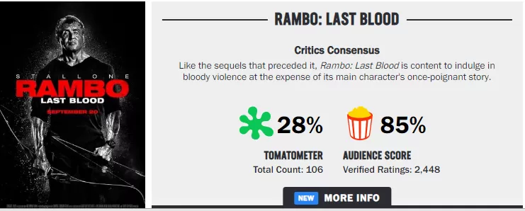 Finalmente, el tercer estreno de este fin de semana fue el regreso de un veterano Rambo. Sylvester Stallone sigue repartiendo golpes y balas y le pisó los talones a la película de Brad Pitt aunque con un presupuesto mucho menor, parece que podría darle algo más de tranquilidad a su estudio, especialmente porque el boca a boca le puede ayudar. Resulta que a pesar que los críticos la destrozaron, la audiencia disfrutó mucho la película de Syl y le ponen un destacable 85% en RT frente a una calificación de B en CinemaScore.