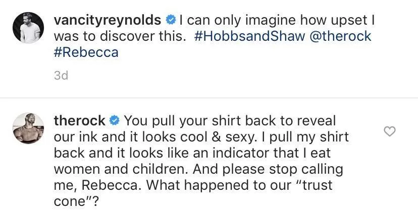 "Una delicia de Hobbs y Shaw cuando el público se vuelve loco con risas y alegría cuando Ryan Reynolds aparece en la pantalla como el "socio sorpresa" de Hobbs: el Agente Locke de la CIA, conocido por apuñalar a los malos en el pecho con un ladrillo. Hace años que conozco este brillante HDP y aprovechamos la oportunidad de combinar nuestro tequila y la química de la ginebra para ofrecer algo de magia al público. Gracias RR por ayudarnos a hacer nuestra pequeña película spin-off, la película número 1 del mundo. A los fanáticos les encanta, así que hemos hecho nuestro trabajo, hermano " - escribió La Roca en su Instagram.