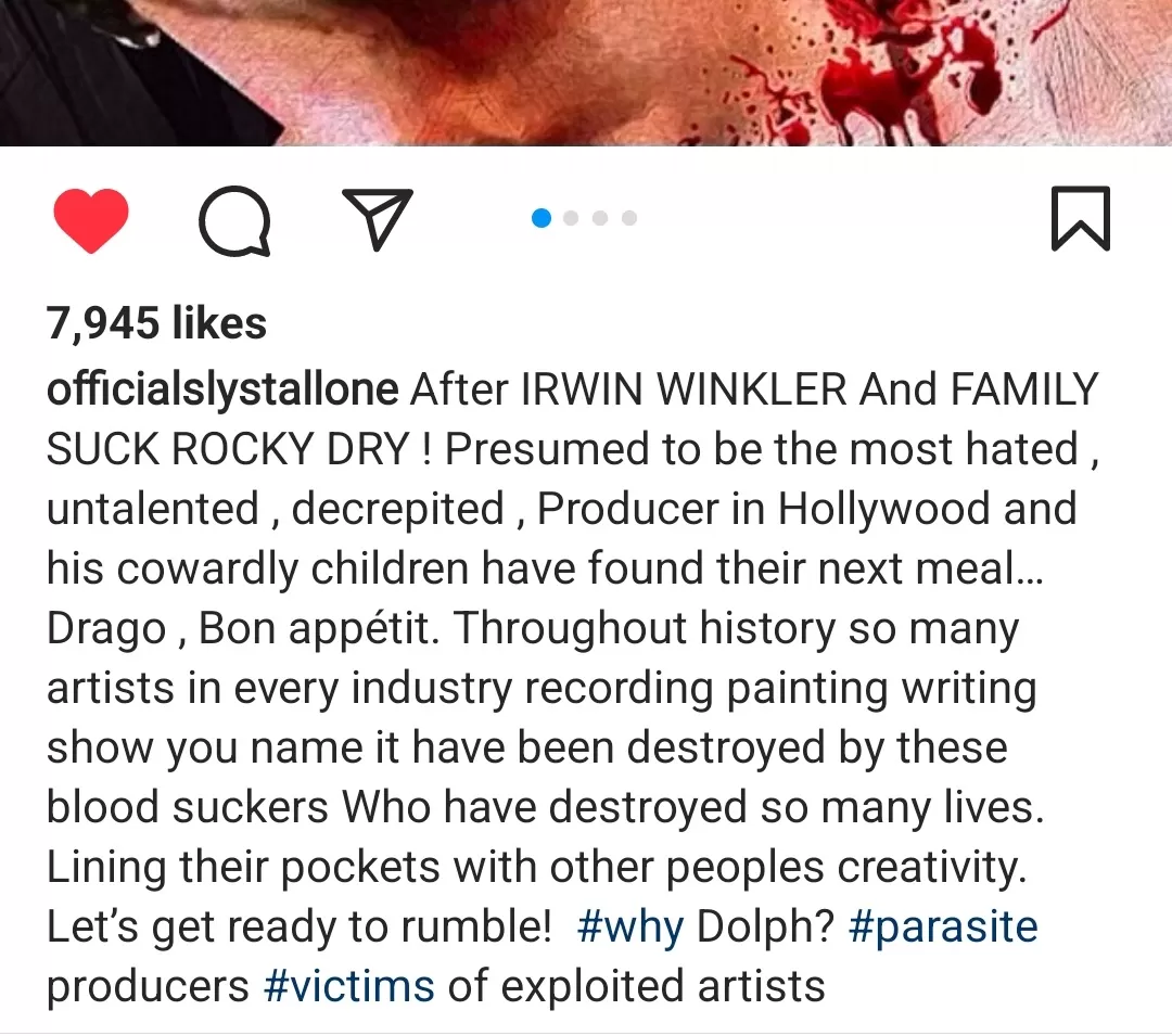"Después de que Irwin Winkler y su familia exprimieran Rocky, posiblemente el más odiado y productor sin talento de Hollywood y sus cobardes hijos me entero de su siguiente almuerzo...Drago, buen provecho. A través de la historia, muchos artistas en cada uno de los trabajos en los que se han involucrado han sido destruidosp or estos chupasangres. Alinean sus bolsillos con la creatividad de la gente. ¿Están listos para la pelea? #porqué Dolph #productoresparásitos #víctimas de artistas explotados".