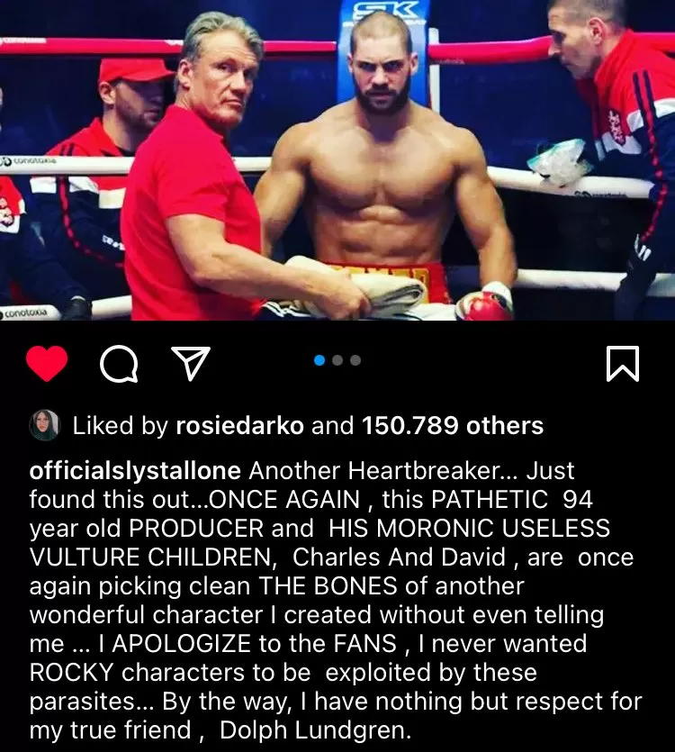 "Otro rompecorazones… acabo de enterarme de esto. ¡Una vez más, el patético productor de 94 años y sus egoístas e inútiles hijos, Charles y David, están volviendo a exprimir hasta los huesos a otro maravilloso personaje que he creado sin siquiera decirme! La verdad, lo siento por los fans, me disculpo con ellos porque nunca quise que Rocky fuese explotado por estos parásitos", continúa el actor.