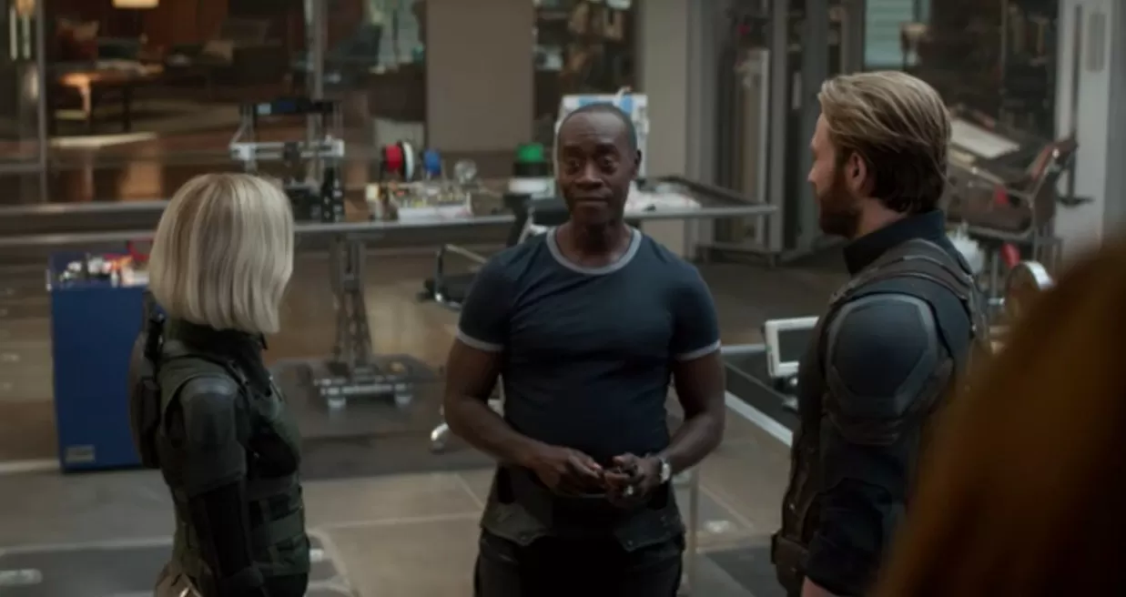 Recordemos la escena en la que Rhodey está hablando con el general Ross sobre un holograma en el complejo de los Vengadores y Steve Rogers entra, acompañado por Viuda Negra, Bruja Escarlata, Vision y Falcon.