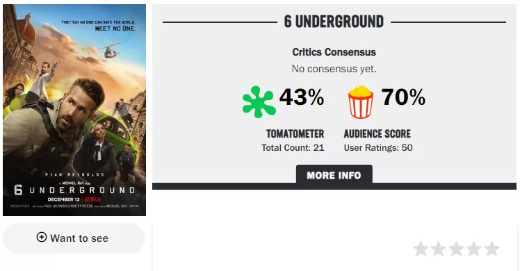 No es ningún secreto que la crítica y Michael Bay no se llevan del todo bien y en sus últimos proyectos han tenido la opinión bastante dividida. A diferencia de las terribles reseñas que recopilaron la películas de Transformers, la calificación que le otorga la crítica a Escuadrón 6 va más en línea con otras cintas de Bay como Pain and Gain (50%) o 13 Horas: Los Soldados Secretos de Bengasi (51%). Aún así, Escuadrón 6 cae ligeramente por debajo.