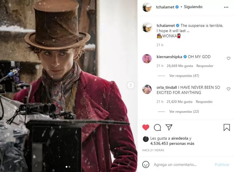 No hay duda alguna que, Timothée Chalamet es uno de esos jóvenes actores de los que seguiremos escuchando por mucho tiempo. Sus premiados trabajos en ‘Call Me By Your Name’, ‘Mujercitas’ y, más recientemente, ‘Duna’, lo han colocado en una posición privilegiada en Hollywood. Sus planes a futuro no son menos ambiciosos, pues el día de ayer, el actor ha sorprendido a todos al publicar una imagen de uno de sus proyectos más esperados: Wonka, la precuela de ‘Willy Wonka y la Fábrica de Chocolate’.