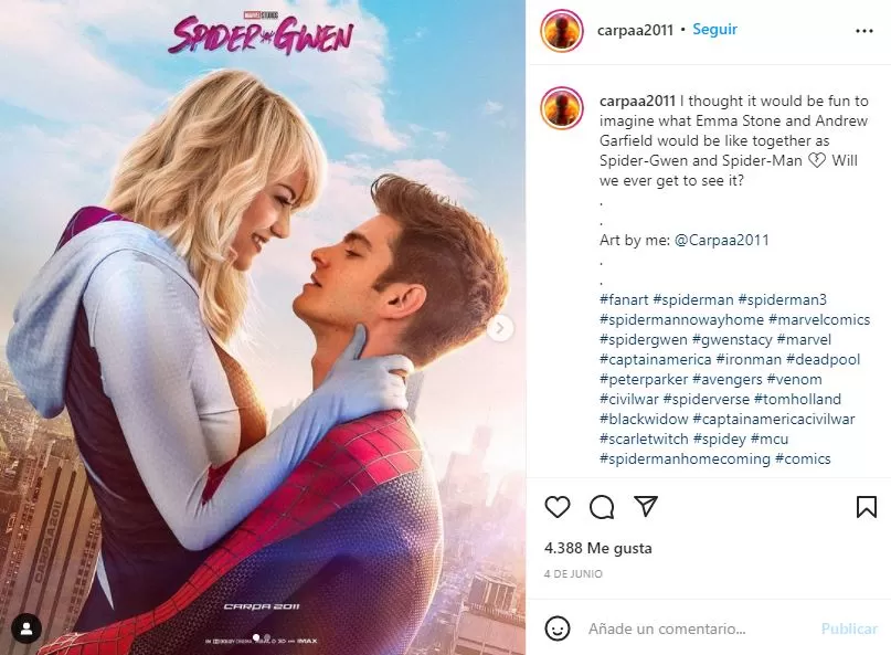 Con movimientos en redes que reclaman su retorno, un afiche hecho por un fan también ha captado la atención del ciberespacio y nos ofrece un vistazo a lo que podría haber sido Spider-Gwen en la versión de Emma Stone, obra del artista @Carpaa2011.