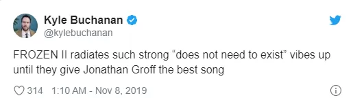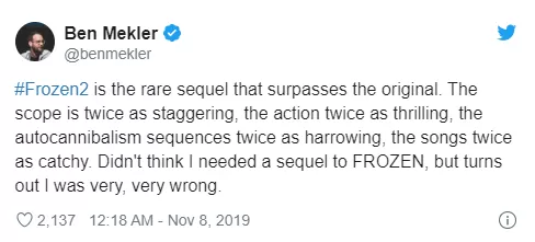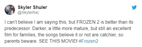 #Frozen2 es la rara secuela que supera al original. El alcance es el doble de asombroso, la acción el doble de emocionante, las secuencias el doble de desgarradoras, las canciones el doble de pegadizas. No pensé que necesitaba una secuela de FROZEN, pero resulta que estaba muy, muy equivocado.