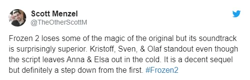 Frozen 2 pierde parte de la magia de la original, pero su banda sonora es sorprendentemente superior. Kristoff, Sven y Olaf se destacan a pesar de que el guión deja a Anna y Elsa en el frío. Es una secuela decente pero definitivamente un paso por debajo de la primera. #Frozen2