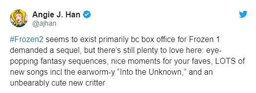 #Frozen2 parece existir principalmente en taquilla, porque Frozen exigió una secuela, pero todavía hay mucho que amar: secuencias de fantasía alucinantes, momentos agradables de tus personajes favoritos, MUCHAS nuevas canciones, incluyendo "Into the Unknown", y una nueva criatura insoportablemente linda.