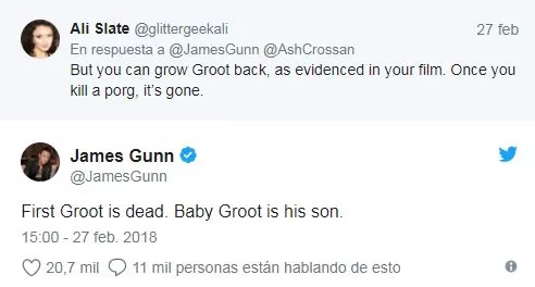 ¿Cómo ha surgido esta revelación? No es primera vez que los fans preguntando sobre este personaje, pero una usuaria pensaba que se podía “resucitar” a Groot de nuevo solo con plantarlo. Esto es lo que Gunn dijo: