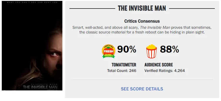 Sonic logró mantenerse por dos semanas consecutivas en el primer lugar pero ahora es tiempo que le ceda la posta a El Hombre Invisible. Esta cinta - anunciada en su momento como parte del Dark Universe - no tiene mayores ambiciones de cohesionar un universo monstruoso y siendo de bajo presupuesto, ha resultado ser más que rentable.