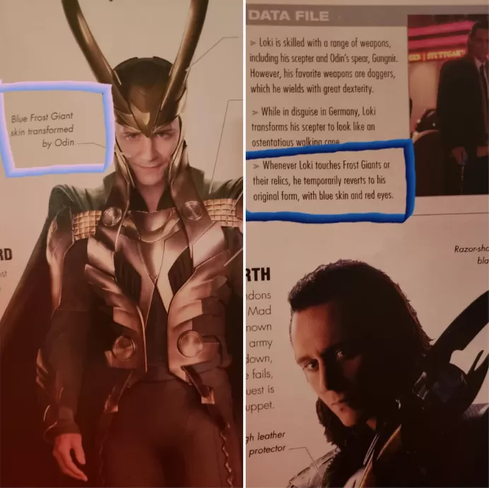 Como dicen las imágenes, la "piel azul del gigante" de Loki es "transformada por Odin" para que parezca que pertenece a Asgard. "Cada vez que Loki toca a gigantes de hielo o sus reliquias, vuelve temporalmente a su forma original, con piel azul y ojos rojos".