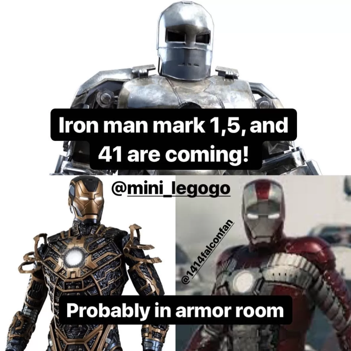 Recientemente se filtró unos sets de LEGO de la película, en donde se muestran algunas versiones anteriores del traje de Iron Man. Específicamente, se dice que veremos el regreso del Mark 1 que Tony construyó en una cueva en Iron Man de 2008. También el Mark 5, que lo vimos por primera vez durante la pelea en el hipódromo con Ivan Vanko en Iron Man 2. Por último, se dice que Mark 41 que formó parte de Iron Legion en Iron Man 3 también estaría presente.
