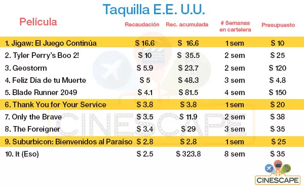 Otro debut en la semana es la película de Miles Teller "Thank You For Your Service" que solo logró recaudar $3.8 millones. La cinta de Universal no ha sido muy respaldada en la taquilla y con $20 millones invertidos en su realización, tiene aún mucho que remar.