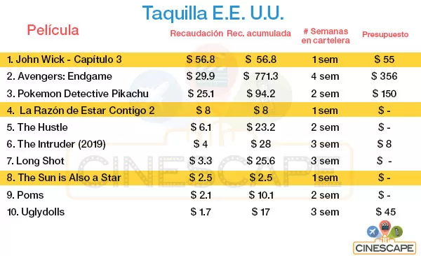 Entre otros estrenos más pequeños se encuentran La Razón de Estar Contigo: Un Nuevo Viaje (disponible en cartelera) que solo logró obtener $8 millones en su debut y en la octava posición tenemos el drama romántico El Sol También es una Estrella que quedó corta con sus $2.5 millones. Esta última la estrenan el 6 de junio por aquí.