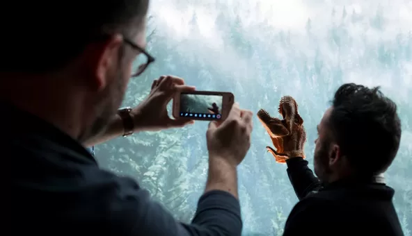 De hecho Colin Trevorrow, el director de la primera cinta, es el encargado de grabar el video mientras sujetaba al T-Rex. El cineasta ha manifestado anteriormente que desea incorporar más animatronics para aportar más “alma y realidad a la película”.