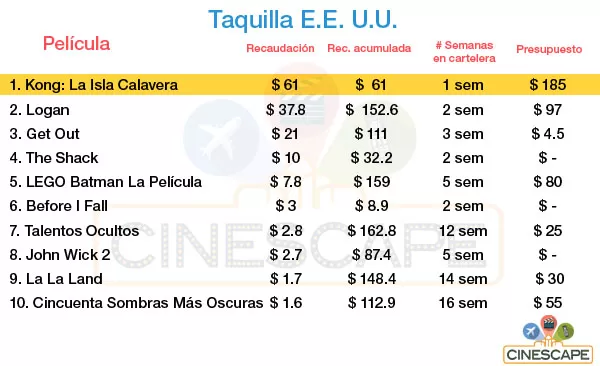 $61 contundentes millones de dólares la ubicaron en el primer lugar, destronando así a Logan, quien lideró la taquilla el pasado fin de semana. Sin embargo, podemos chequear en el cuadrito de la parte inferior que $61 millones no le hacen todavía ni cosquilla porque la película costó $185 millones en hacerse. Y eso que en ese número no entran los gastos de publicidad.