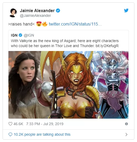 A través de su cuenta de Twitter, la actriz que interpretó a Lady Sif en Thor: Un Mundo Oscuro, "levantó la mano" ante una publicación de IGN que decía lo siguiente: