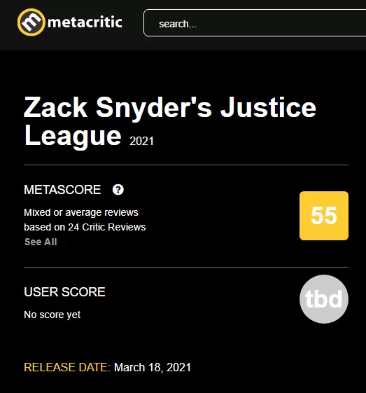 En el portal de Metacritic, la calificación está mucho más pareja con la de 'Liga de la Justicia' 2017. La versión de Zack Snyder recibe una calificación de 55 en base a 24 críticas, mientras que la estrenada en cines obtuvo 45 en base a 52 críticas.