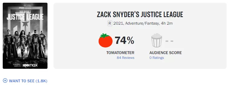 De momento, y en base a 84 críticas (al cierre de este artículo), 'Liga de la Justicia' de Zack Snyder alcanza un 74% de frescura en el portal Rotten Tomatoes, aún sin consenso. De por sí, esta calificación ya parece una mejora considerable si tomamos en cuenta que la película del 2017 obtuvo un 40% de parte de los críticos en base a 400 reseñas, si bien los fans la disfrutaron mucho más, otorgándole un 71%.