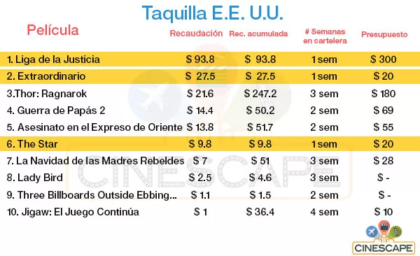 Liga de la Justicia merecía una nota especial tras su debut en salas norteamericanas pero no por ello podemos dejar de lado los demás datos del fin de semana. A pesar que inicialmente Liga de la Justicia reportaba una recaudación de $96 millones durante el fin de semana, al final los resultados develaron que fueron un par de millones menos los que entraron a las arcas de Warner Bros.